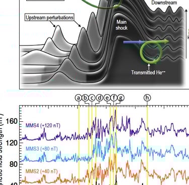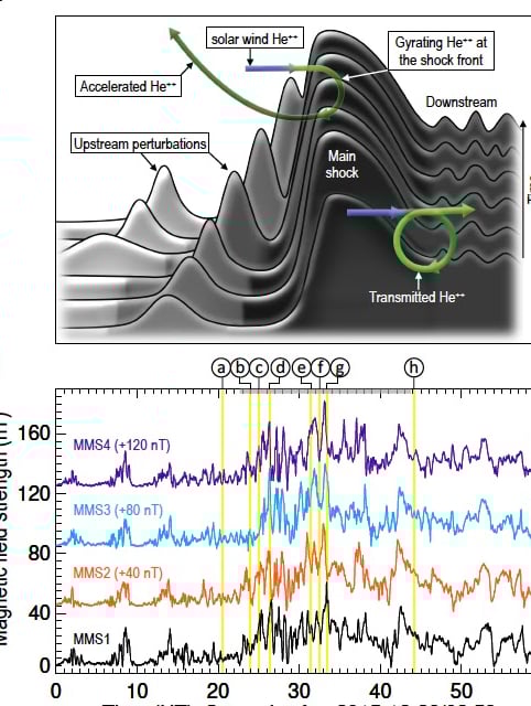 A schematic of the shock profile and representations of solar wind ion trajectories at the shock front (top), and in-situ measured magnetic field profiles [Madanian et al., 2021].