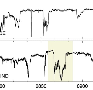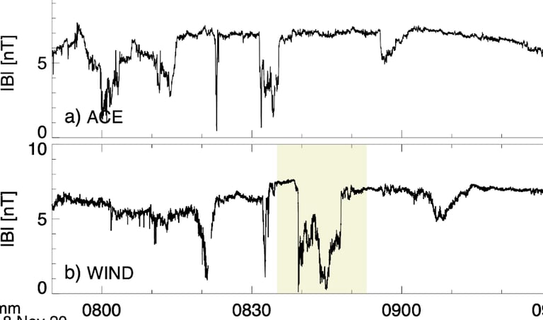 Changes in the shape of a magnetic anomaly carried by the solar wind and measured by two solar wind monitors [Madanian et al. 2022].