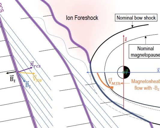 Interaction of a reconnecting current sheet with Earth's bow shock and magnetopause [Madanian et al. 2022].